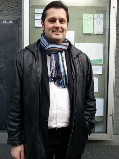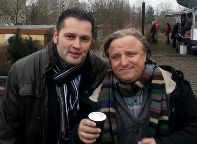 Kaffeepause mit Axel Prahl in Köln am frühen Morgen. Es ist kalt, aber Axel