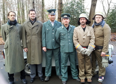 Zusammen mit den Kollegen der Stasi, Volkspolizei und Feuerwehr vor einem Trabi.