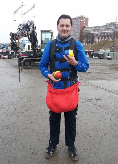 hat mir das Spiel „Schleuderball“. Ich hänge mit einem Seil an einem Kran und muss